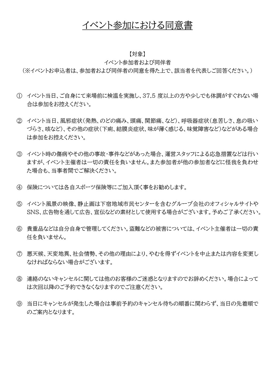 1. イベント時の傷病やその他の事故などがあった場合、イベント主催者は一切の責任を負いません。また参加者が他の参加者などに怪我を負 わせた場合も、当事者間でご解決ください。