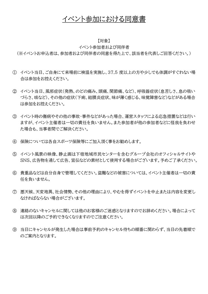 イベント参加者および同伴者の皆様には、「イベント参加における同意書」(※下記参照)にご同意いただく必要がございます。イベント申込者は、参加者および同伴者の同意を得た上で該当者を代表しご回答ください。